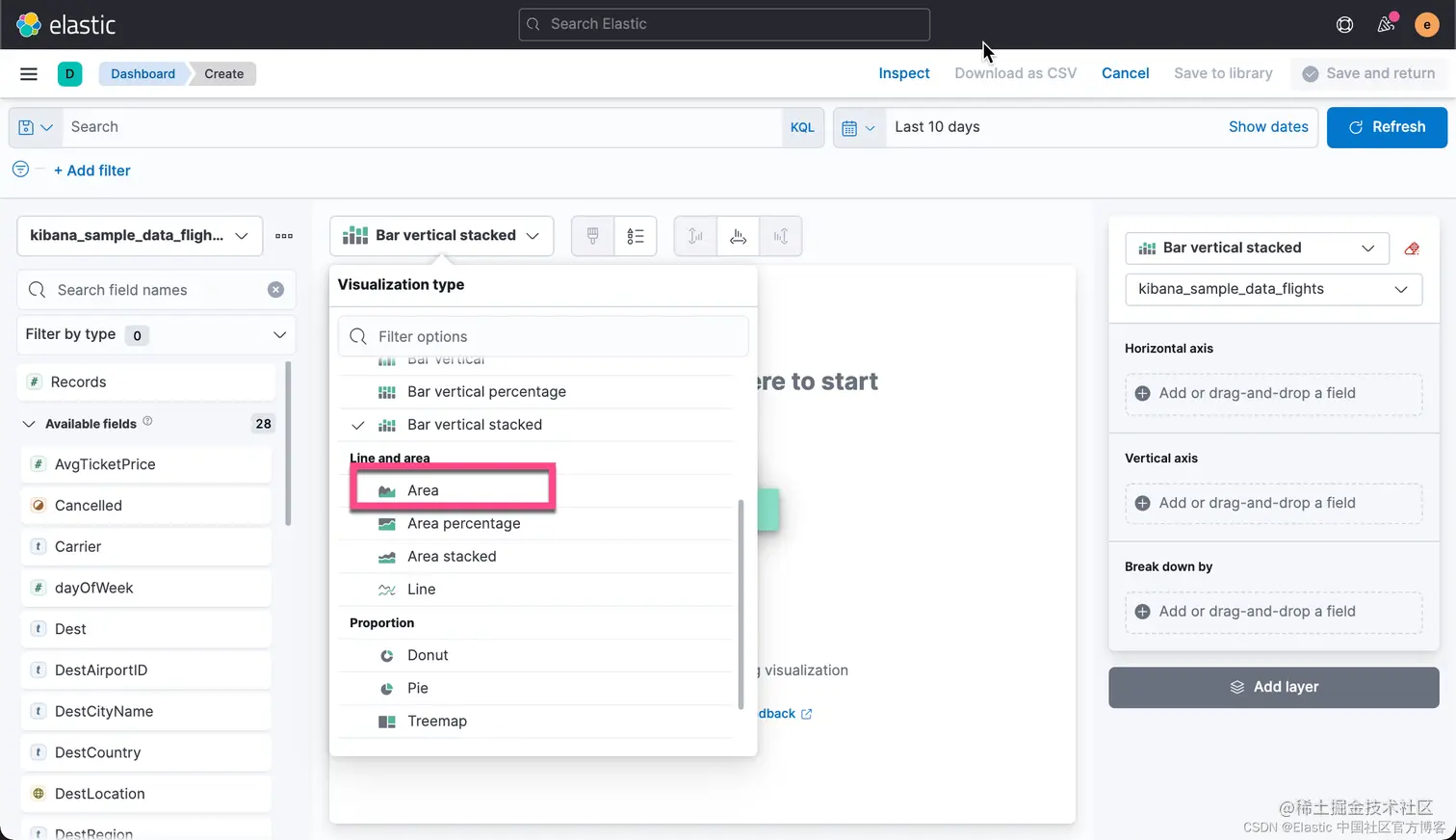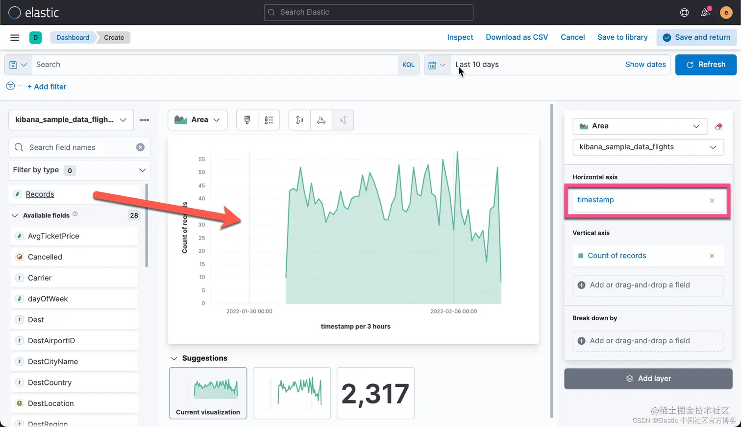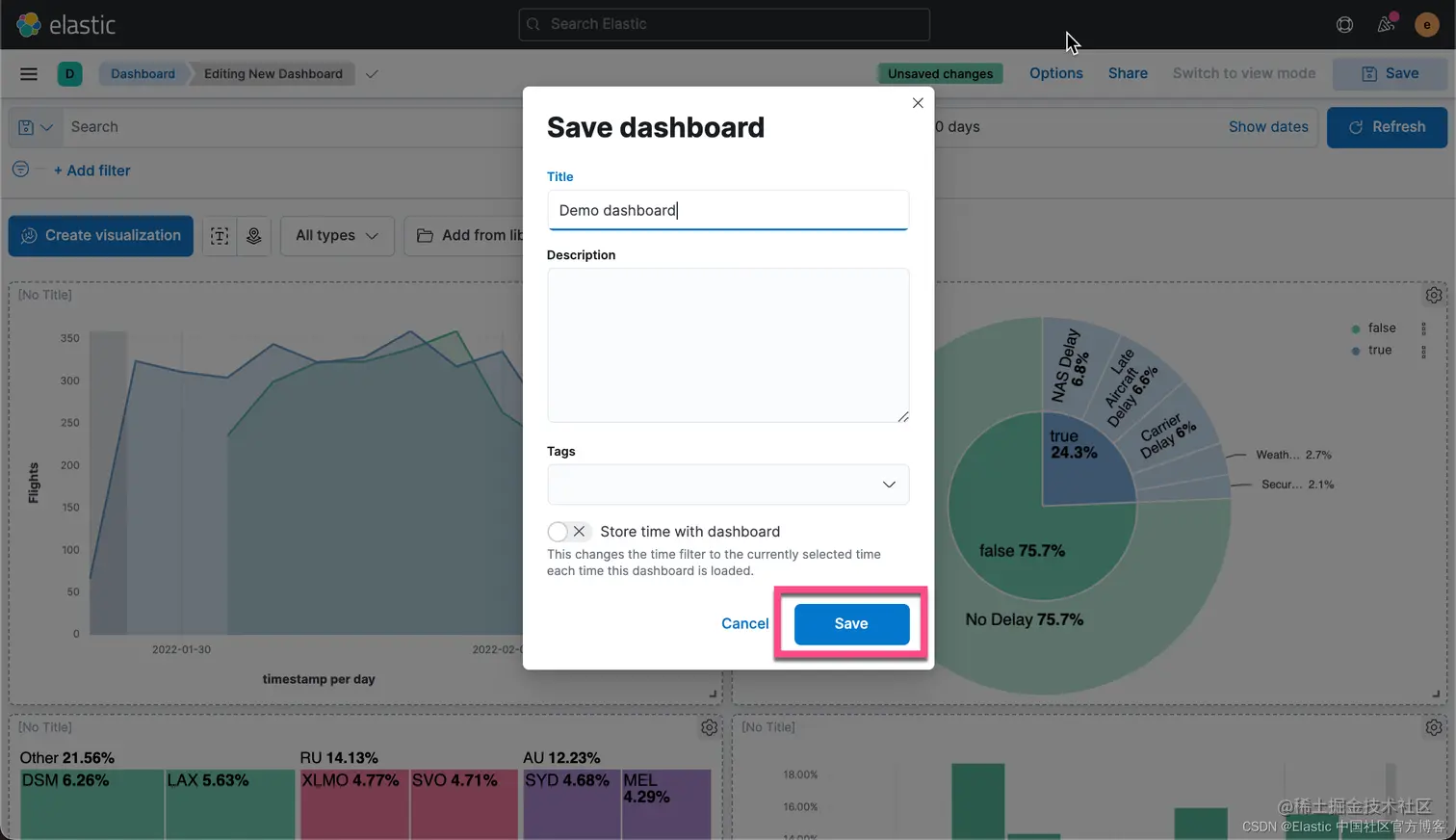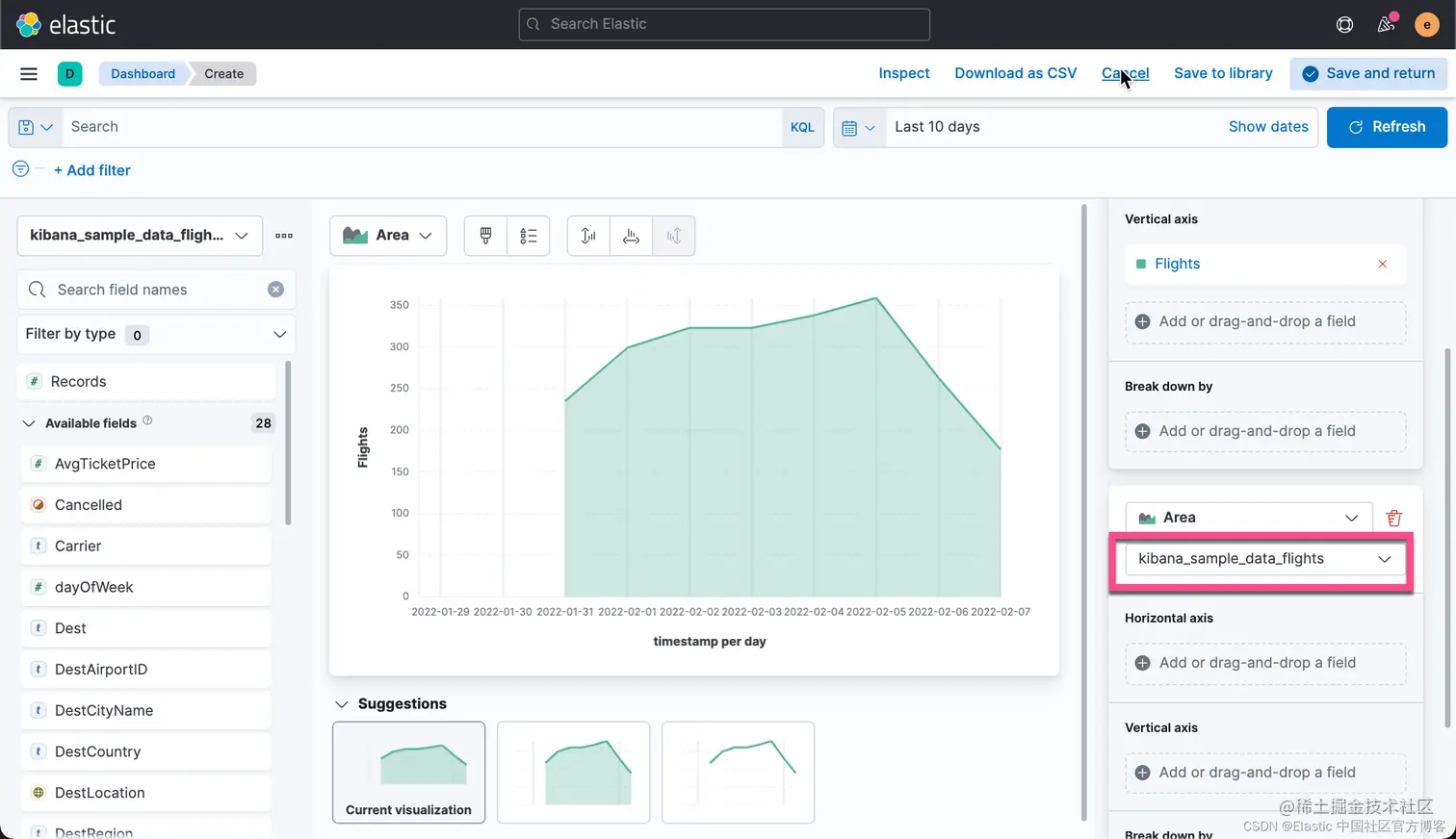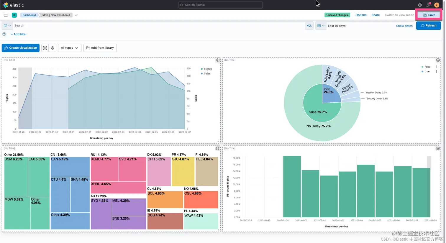 我们还是打开我们之前创建的 Flights Dashboard,并选中其中的一个可视化: