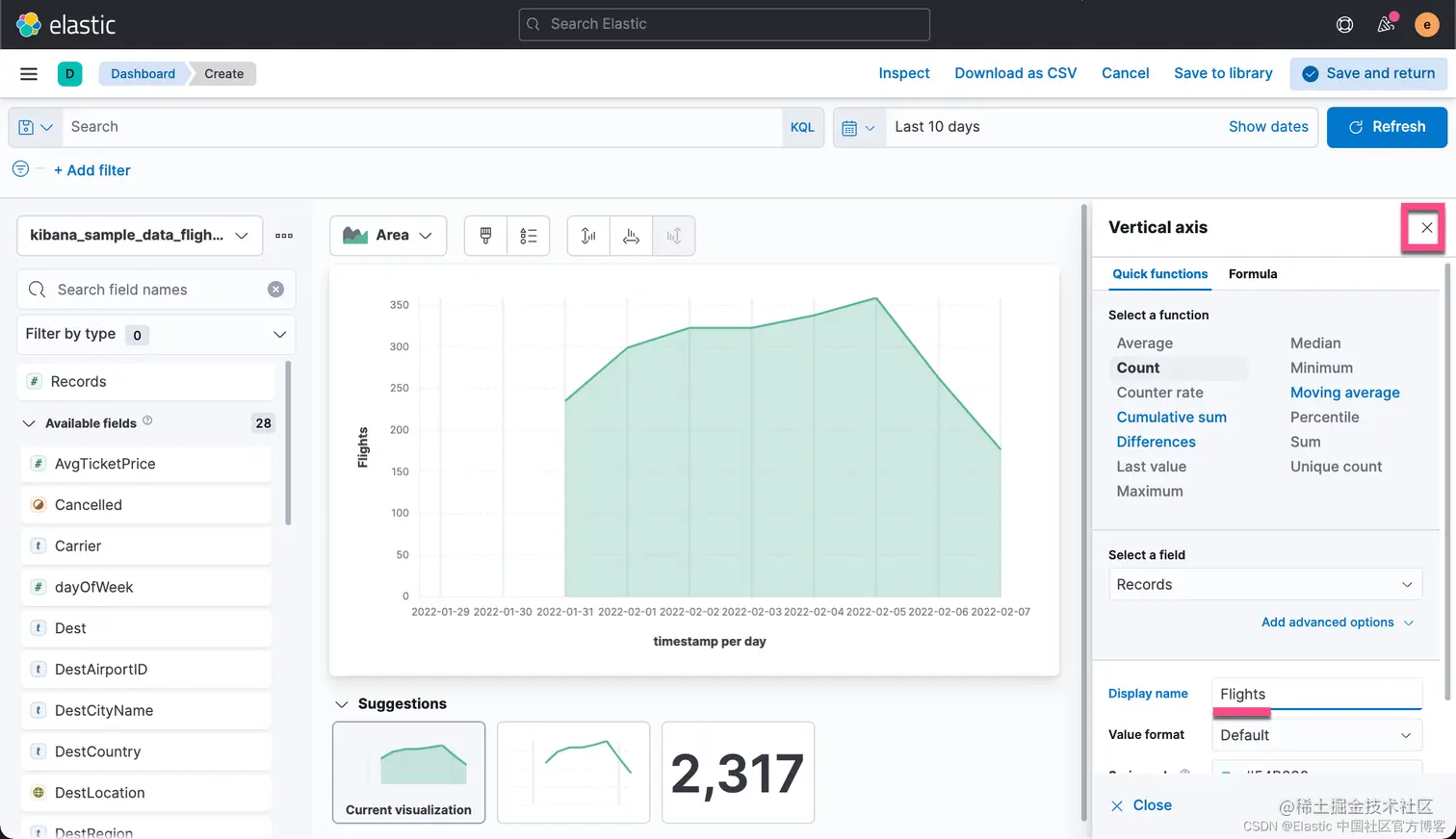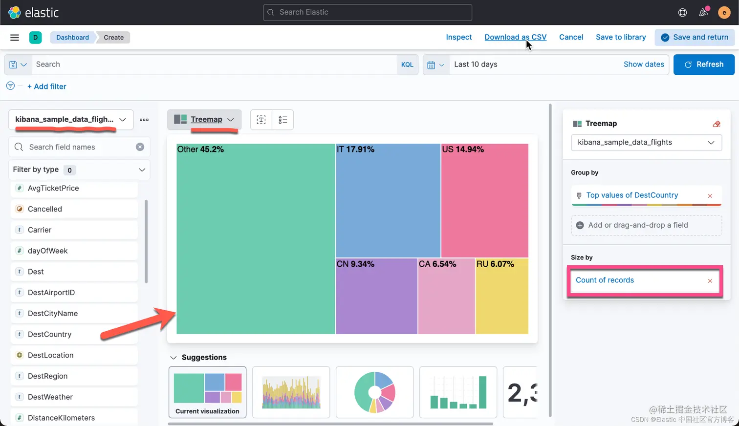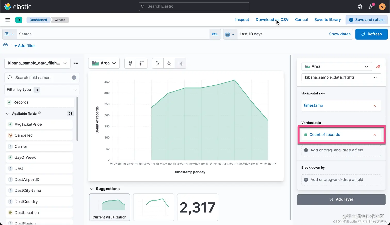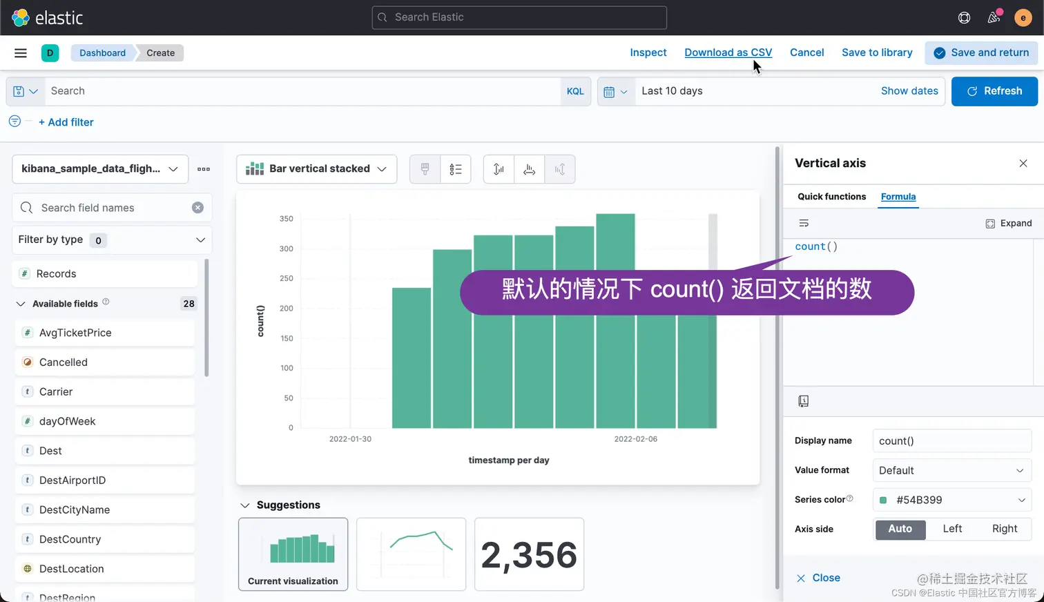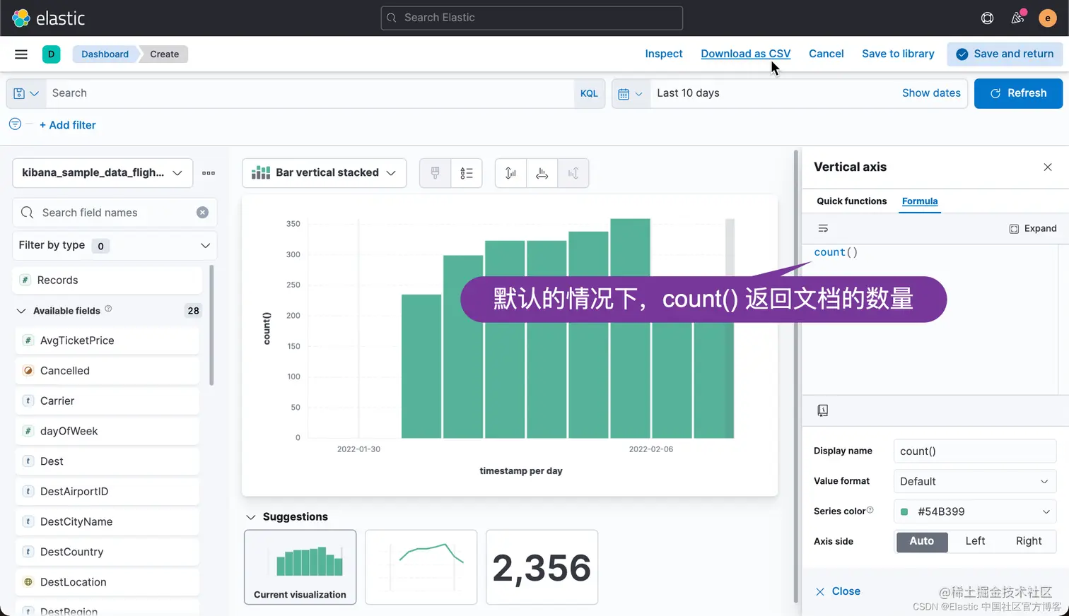 有时,你可能希望把你可视化中的数据进行导出。事实上,你甚至可以把你所有的 Lens 可视化里的数据都导出来并保存到 CSV 文件中。CSV 是一种以 , 分隔的值。你可以用你们所熟悉的工具进行打开并进行分析。