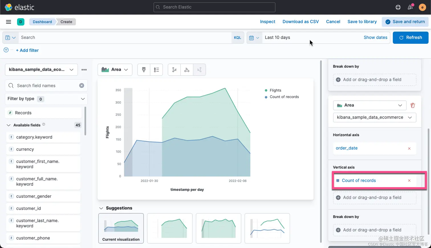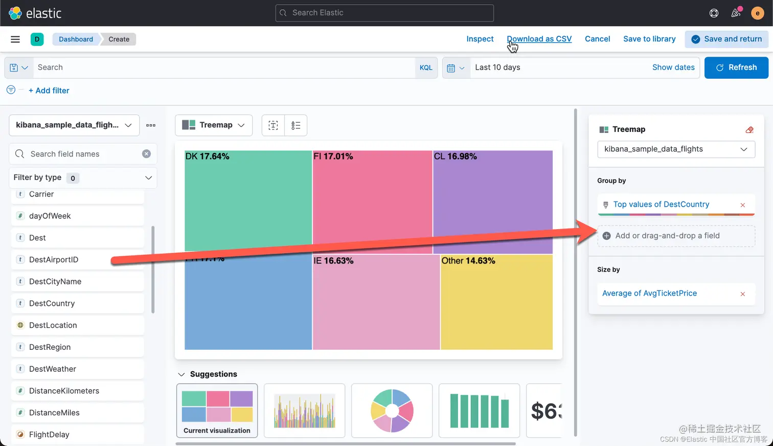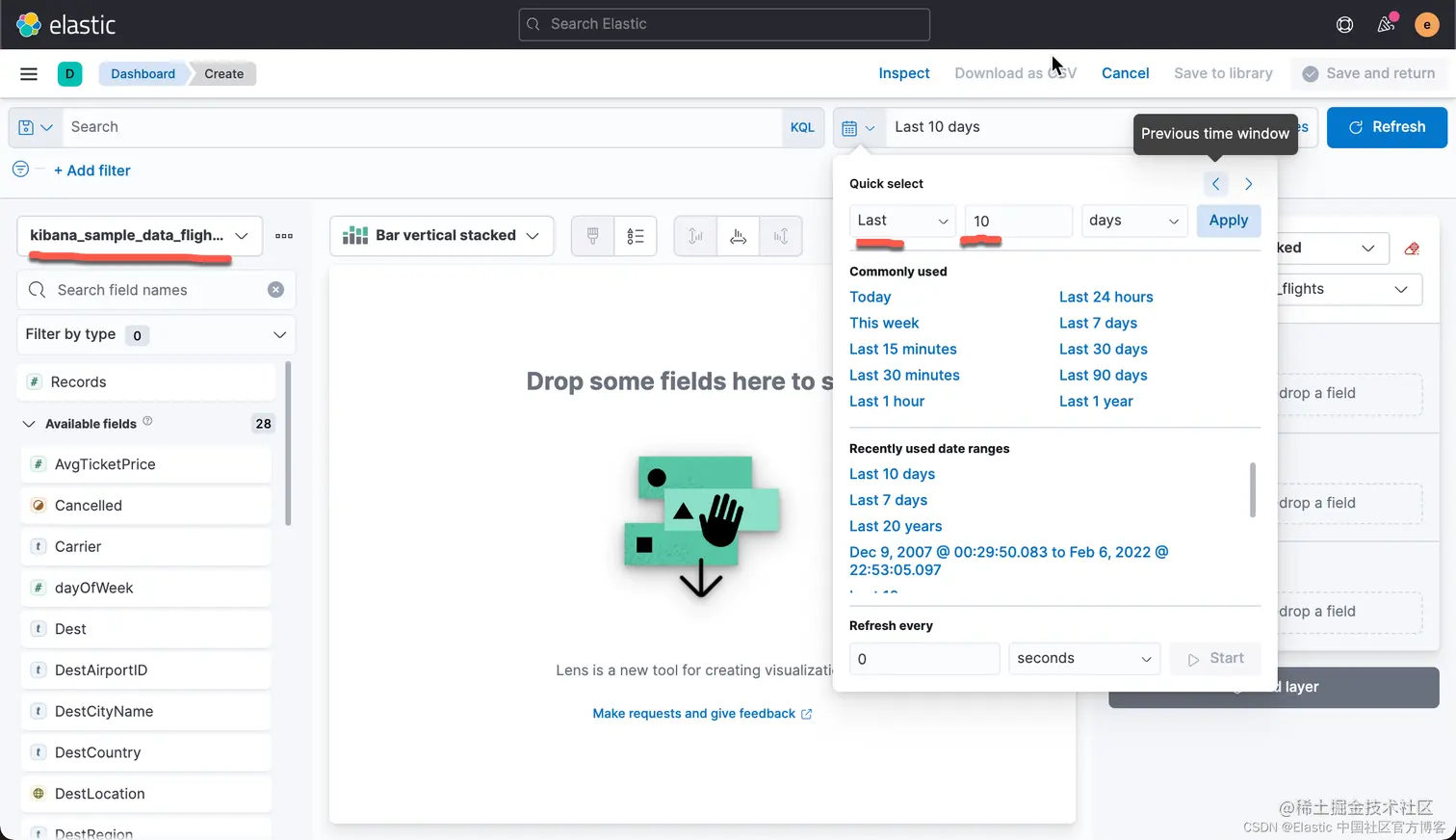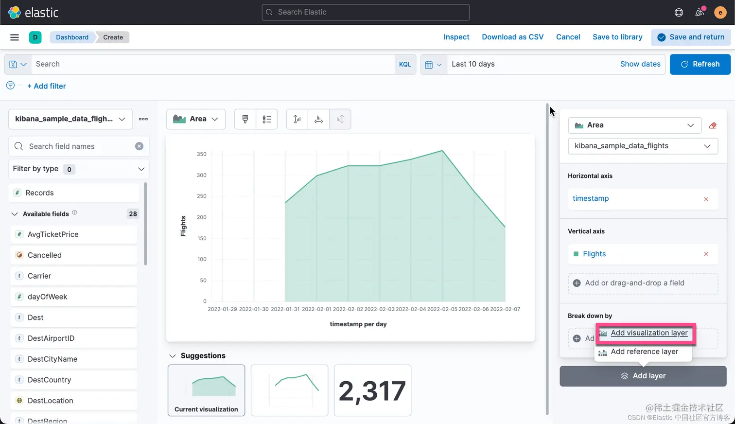 有时,你可能希望把你可视化中的数据进行导出。事实上,你甚至可以把你所有的 Lens 可视化里的数据都导出来并保存到 CSV 文件中。CSV 是一种以 , 分隔的值。你可以用你们所熟悉的工具进行打开并进行分析。