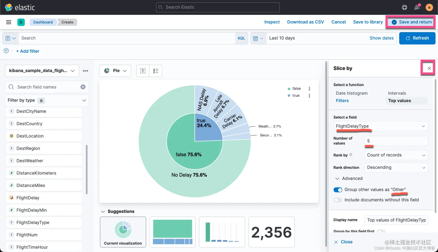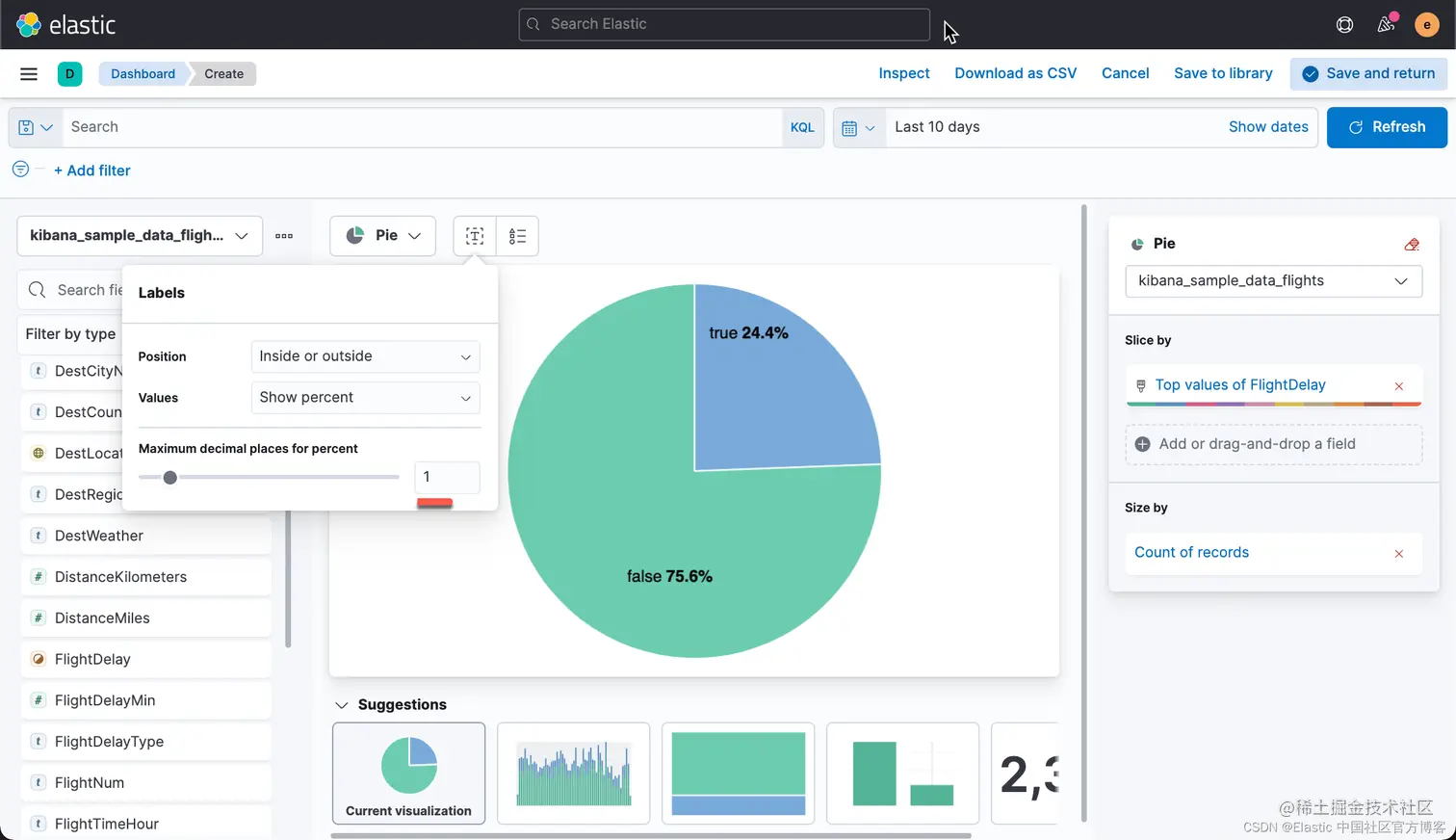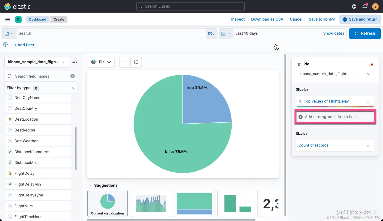 首先,我们选择 kibana_sample_data_flights 索引,并设置 chart type 为 Pie。拖拽 FlightDelay 进入工作区。