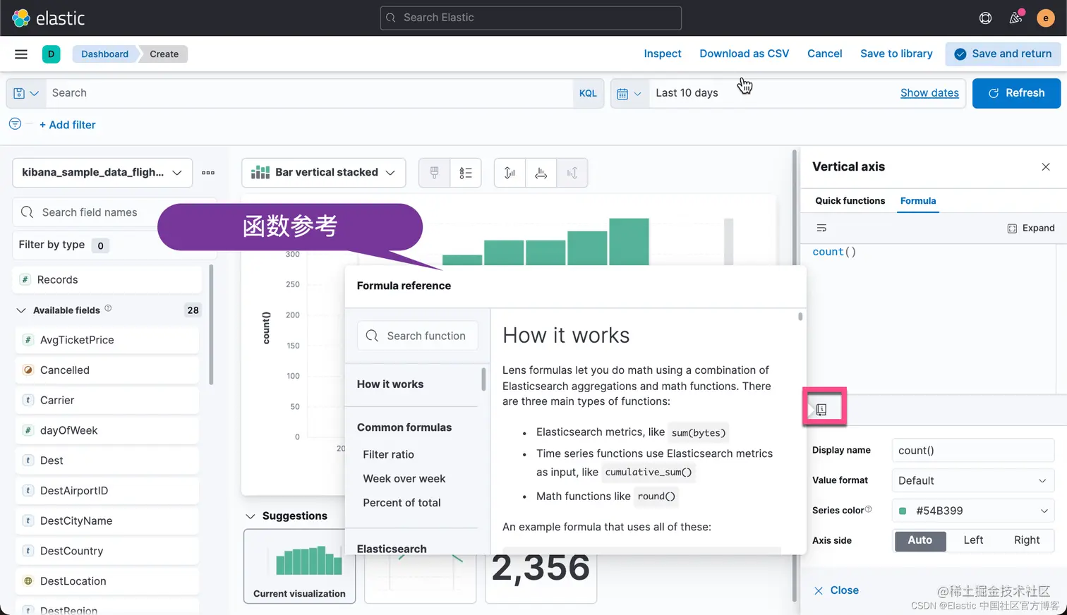 我们可以定制我们的函数。函数可以代入一些参数。比如,你可以使用 kql 参数来传入一个查询到一个函数里。这里的 kql 也就是我们所说的 KQL 查询,也是在 Discover 里的搜索框里默认的查询。如果大家对这个不是很熟的话,请参考我之前的文章 “Kibana: 如何使用 Search Bar”。如果我们使用定制的函数的话,那么搜索的结果就是按照这个函数返回的值来进行计算的。比如,我们把 fomula 定义为: