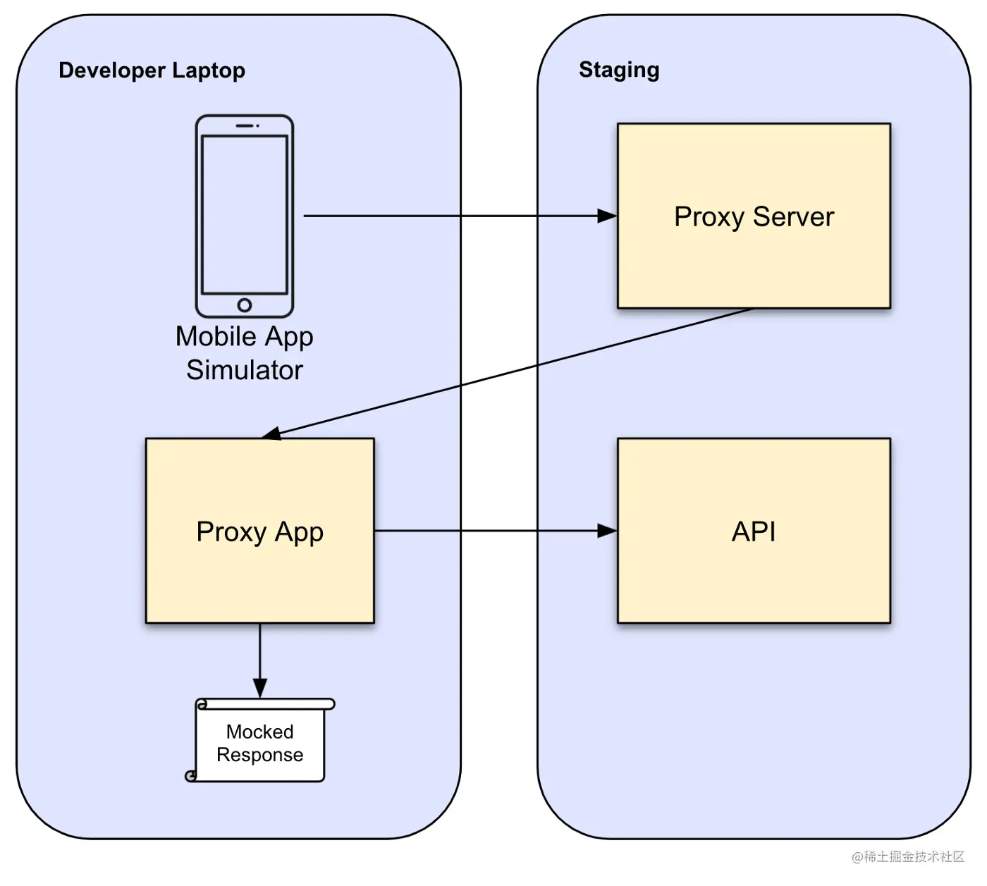几年前,Lyft开发了一款代理应用,作为一种帮助移动应用开发者将开发工作流程与后端服务团队分离开来的工具。它是一个Electron应用程序,在移动应用程序对预发环境API的调用之间充当代理。开发人员将移动应用程序连接到代理服务器,为每个用户提供一个唯一的URL。默认情况下,代理将把所有请求转发到预发环境。用户可以选择覆盖特定的调用并返回完全模拟的数据,或者在预发环境的响应中改变某个字段。这使得手机开发者能够在后端API仍处于开发阶段时测试应用的变化。设置是这样的: