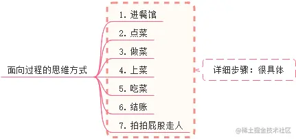 | 面向过程 | 一系列详细步骤 | 都放到解决问题的每一个详细的步骤上面(方法) | 思考每一个具体的详细步骤 |