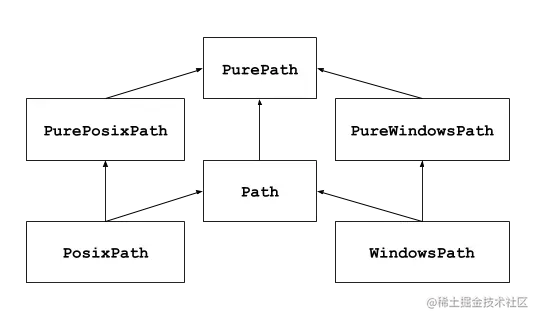 pathlib中的路径类分为2种:纯路径和具体路径,纯路径(PurePath)没有I/O的计算操作,具体路径从PurePath中继承并提供了I/O操作。如果之前没用过pathlib或者不知道用哪个类,大部分情况下可直接使用Path类。