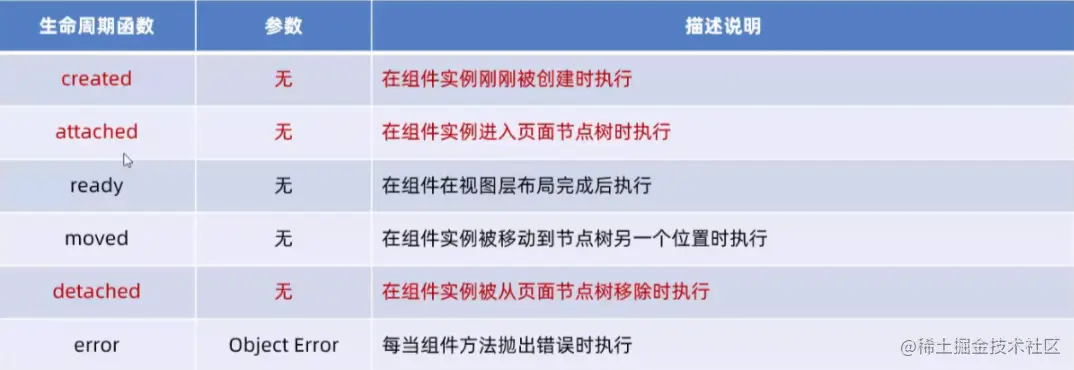 6.2 组件主要的生命周期函数(created、attached、detached)
