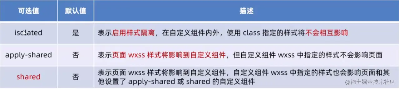 默认情况下,自定义组件的样式隔离特性能够防止组件内外样式互相干扰的问题。但有时,我们希望在外界能够控制组件内部的样式,此时,可以通过 stylelsolation 修改组件的样式隔离选项,用法如下: