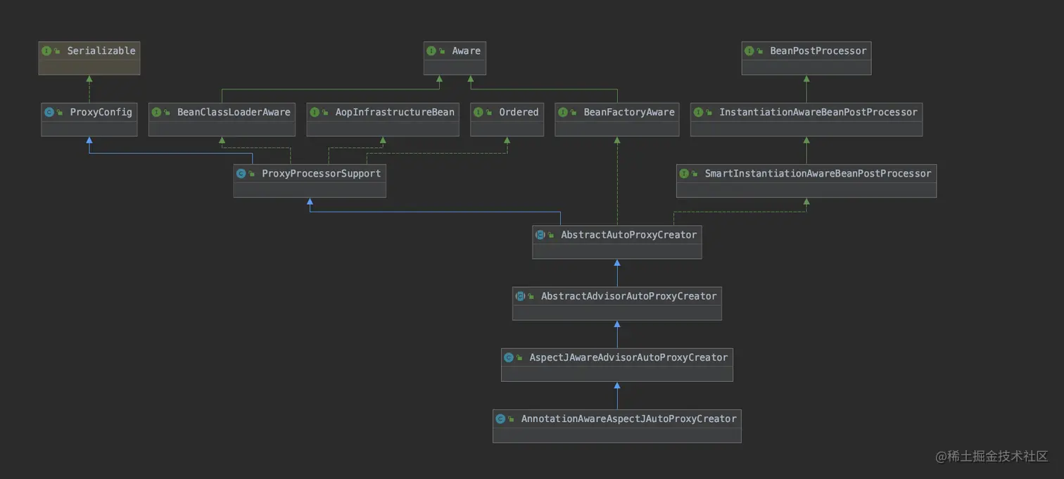 看一下这个类的类图,AnnotationAwareAspectJAutoProxyCreator实现了AbstractAutoProxyCreator抽象类,在这个抽象类中,实现了BeanPostProcessor生命周期接口。
