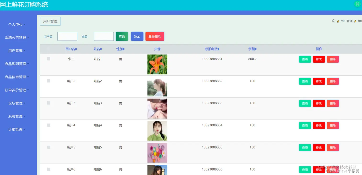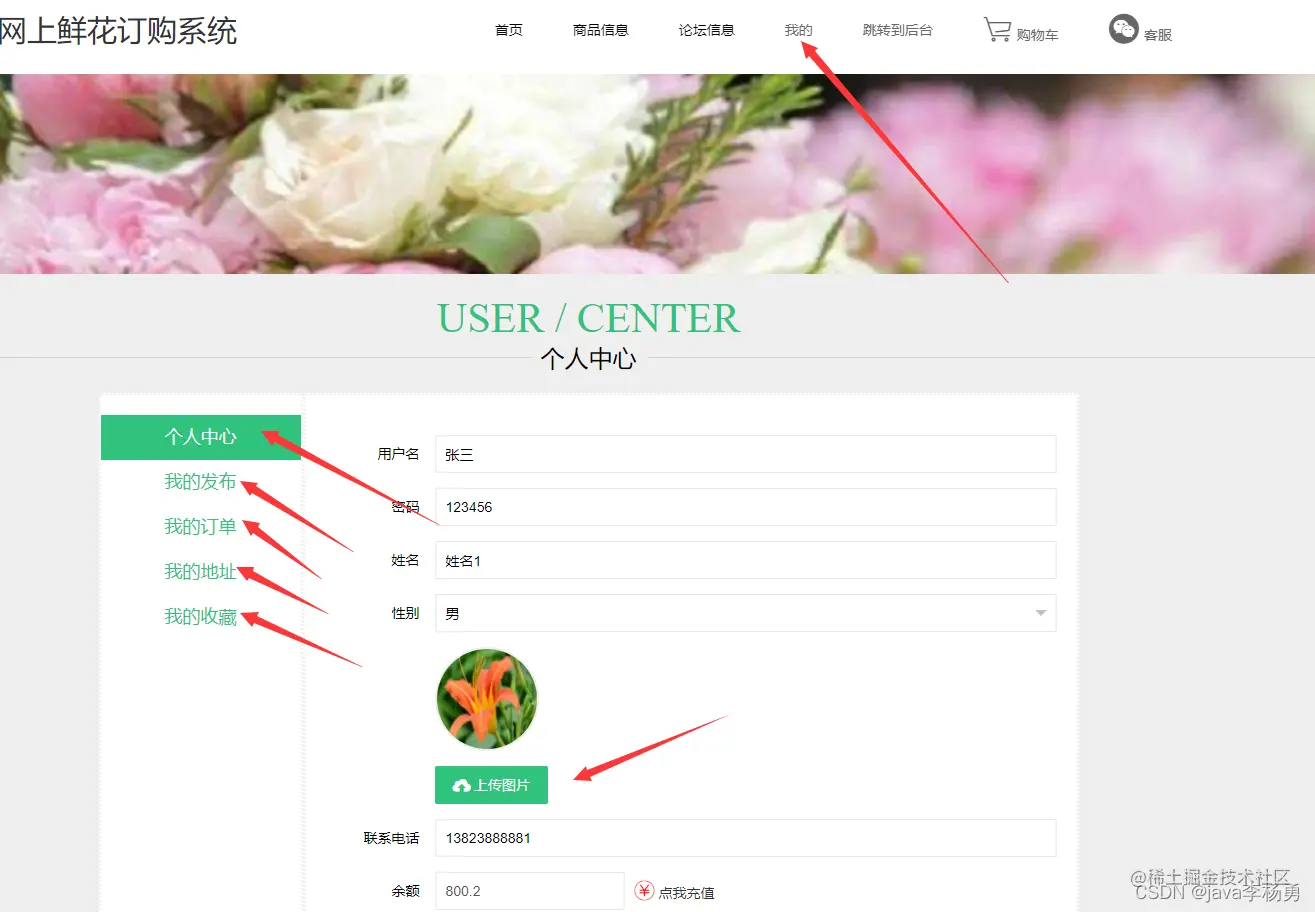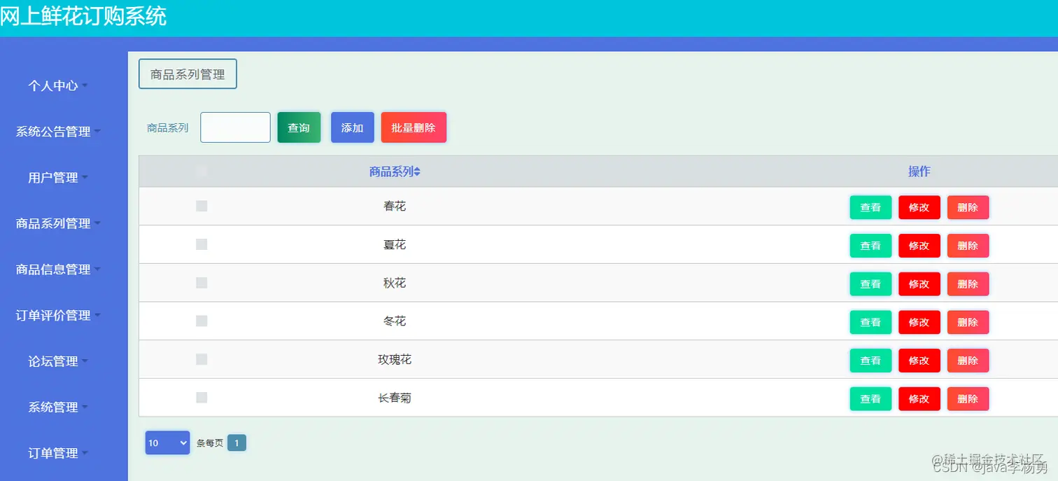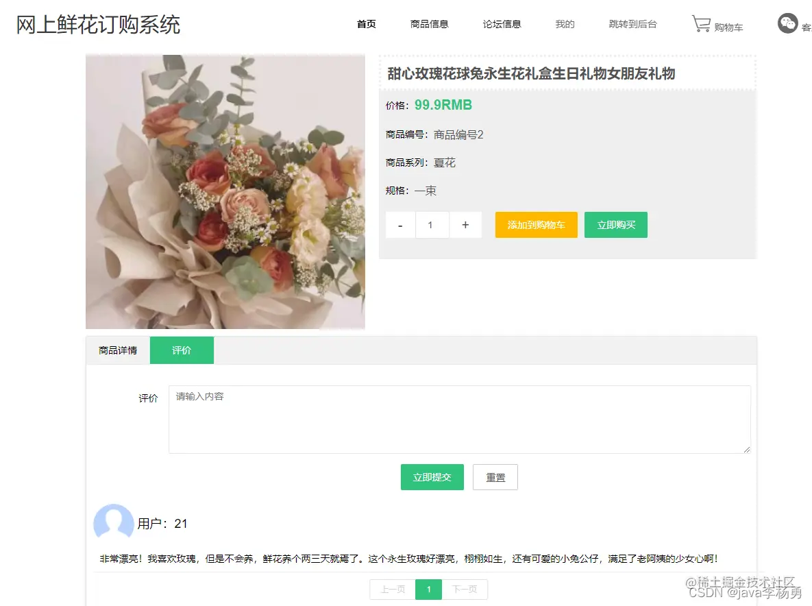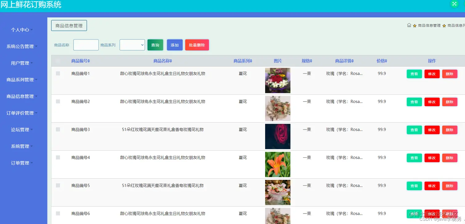 本鲜花商城系统主要功能设计为实现管理员;个人中心、系统公告管理、用户管理、鲜花类型管理、鲜商品信息管理、订单评价管理、鲜论坛管理、系统管理、订单管理,用户;个人中心、订单评价管理、我的收藏管理、订单管理,前台首页;首页、商品信息、论坛信息、我的、跳转到后台、购物车客服等信息管理功能。