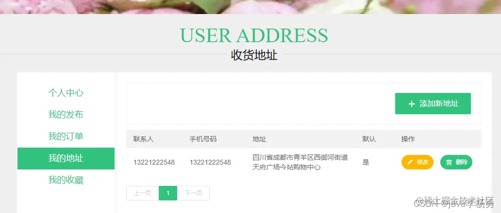 在我的个人中心可以查看我的发布、我的订单、我的地址修改以及我的收藏模块和个人信息模块