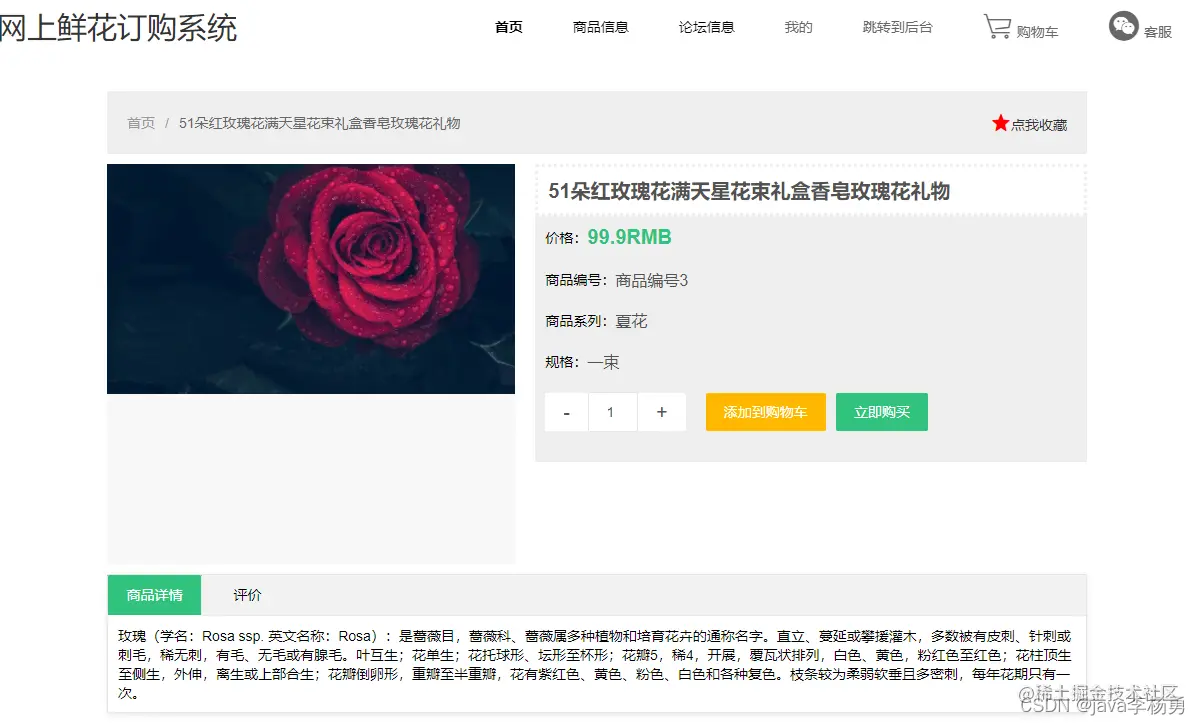 商品详情:可加入购物车、修改数量、立即购买和收藏商品