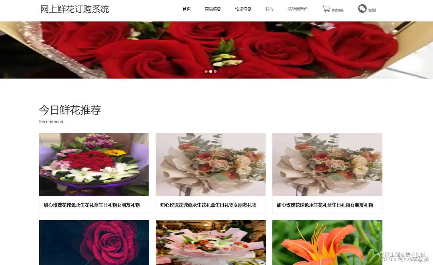 首页主要功能介绍:商品信息、论坛信息、我的、跳转到后台、购物车客服等信息管理功能
