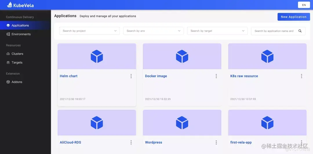 目前通过 VelaUX ,用户可以管理扩展,连接 Kubernetes 集群,分配交付目标,规划环境和交付各类型应用,并观测应用运行状态,实现应用交付的完整闭环。