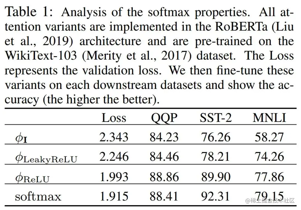 研究者经过实证确认了 softmax 操作的两种可能在性能表现中发挥重要作用的关键特性,其一是确保注意力矩阵 A 中的所有值是非负的,其二是提供一种非线性重加权机制来聚集注意力连接的分布并稳定训练。为了验证这些假设,研究者设计了如下表 1 中的初步研究。