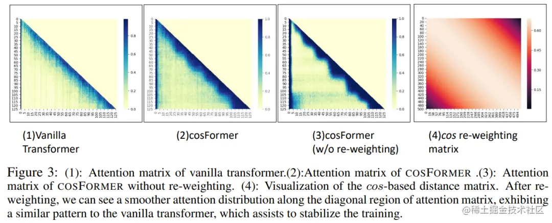 基于上述假设,要满足 softmax 的第二种特性需要一种可分解的重加权机制,该机制可以将近期偏差引入到注意力矩阵。研究者提出了一种能够完美满足目标的 cos-based 重加权机制。通过上图 3(2)和(3)中比较注意力矩阵,可以看到,COSFORMER 能够比不具有重加权机制的 COSFORMER 执行更多的局部性。