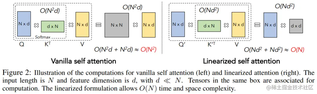下图 2 为原始自注意力(左)与线性注意力(右)的计算示意图。