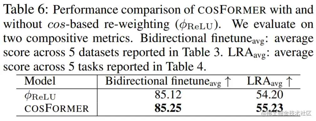 最后,该研究进行消融实验,以了解 COFORMER 中具有和不具有重重加权机制的影响,如表 6 所示,COSFORMER 在没有重重加权的情况下取得了更好的整体结果,显着提高了双向微调和 long-range-arena 的平均分数。这验证了所提出的重重加权有效地结合了自然语言任务的局部归纳偏差。