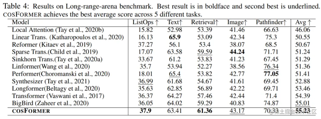 如表 4 所示,总体上来说 COSFORMER 在所有任务中都取得了具有竞争力的结果,同时在 ListOps 和文档检索方面取得了最佳性能。值得一提的是,COSFORMER 在 Long-range-arena 基准测试中取得了最好的整体分数,是仅有的两个超越 vanilla transformer 架构的模型之一。