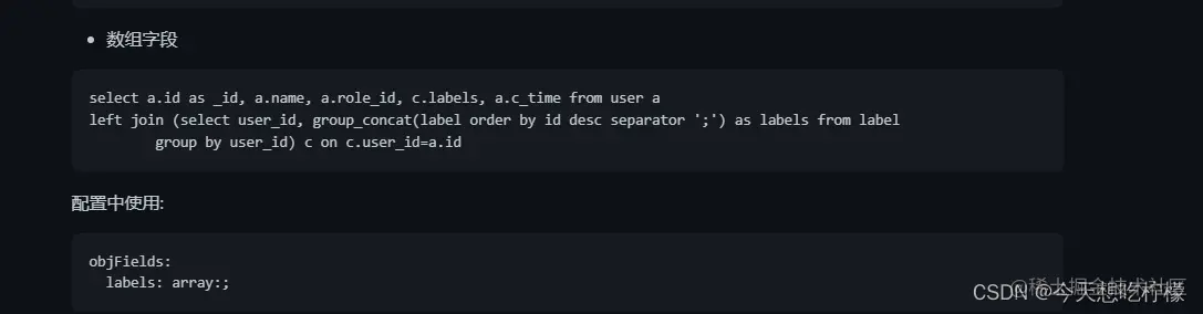 canal中提到了可以通过group_concat来操作,但是这里需要考虑一个长度的问题,不是极其长的可用。这里同步过去在elasticsearch中是一个用;拼接的字符串。