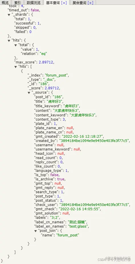 可以发现post_type是出现了。论证,elasticsearch新增字段对旧的文档是没有影响的,但是对于新的文档是有效的。