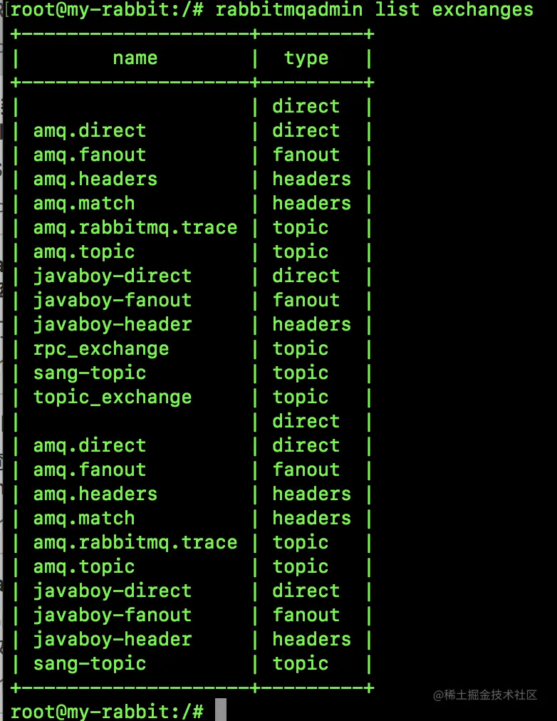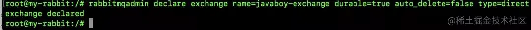 rabbitmqadmin declare exchange name=javaboy-exchange durable=true auto_delete=false type=direct