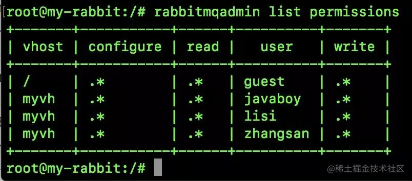 rabbitmqadmin list permissions