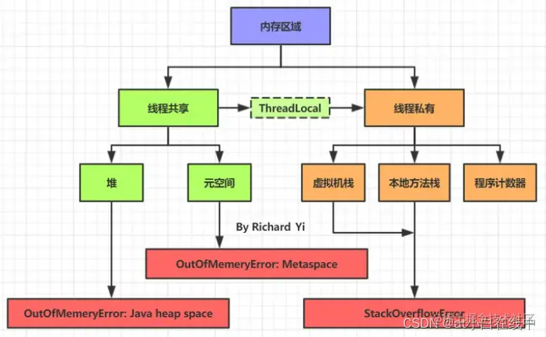 因此,为了线程切换后能恢复到正确的执行位置,每条线程都需要有一个独立的程序计数器,各条线程之间计数器互不影响,独立存储。每个线程在创建后,都会产生自己的程序计数器和栈帧,程序计数器用来存放执行指令的偏移量和行号指示器等,线程执行或恢复都要依赖程序计数器。此区域也不会发生内存溢出异常。