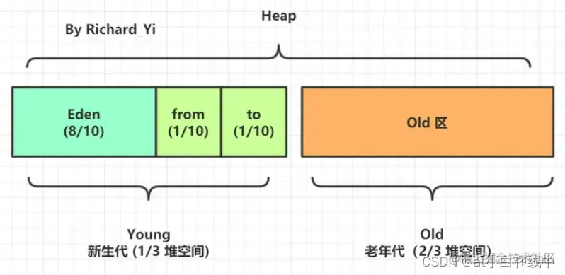 因为新生代是由Eden + S0 + S1组成的,所以按照上述默认比例,如果eden区内存大小是40M,那么两个survivor区就是5M,整个young区就是50M,然后可以算出Old区内存大小是100M,堆区总大小就是150M。