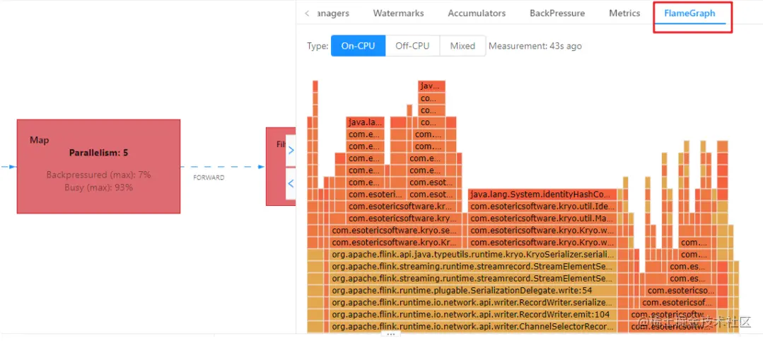 - 使用火焰图功能判断用户的代码是否存在性能问题,,Flink 1.13 直接在 WebUI 提供 JVM 的 CPU 火焰图,默认是不开启的,需要修改参数:rest.flamegraph.enabled: true #默认 false。修改后,用来分析 Task Thread 是否跑满一个 CPU 核。