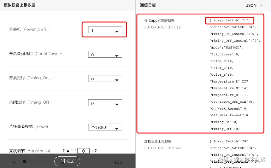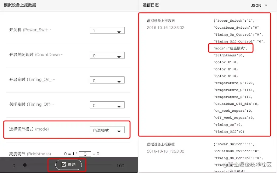 在云端虚拟设备后台选择调节模式为“色温模式”,并点击“推送”按钮,虚拟设备将上报数据到机智云调试APP,您可以看到机智云调试APP界面中的选择调节模式变为了“色温模式”,同时云端虚拟设备后台的“通信日志”上会显示“虚拟设备上报数据” ,并自动打印通信日志。