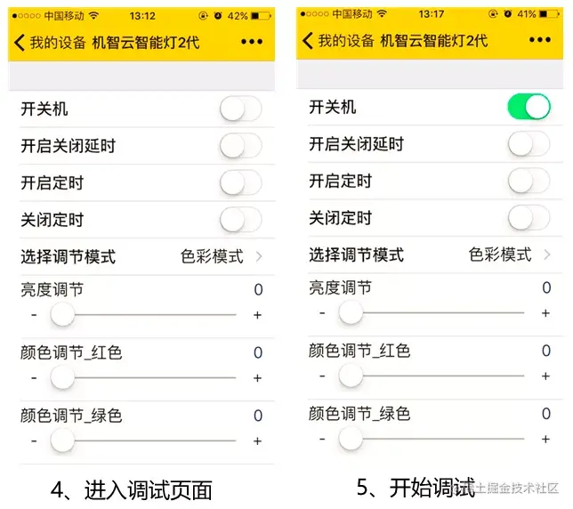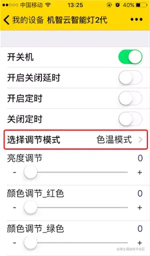 点击红框《机智云智能灯2代》,进入该虚拟设备的手机调试APP界面,以“开关机”为例,进入机智云调试APP调试界面,开启智能灯“开关机”键。