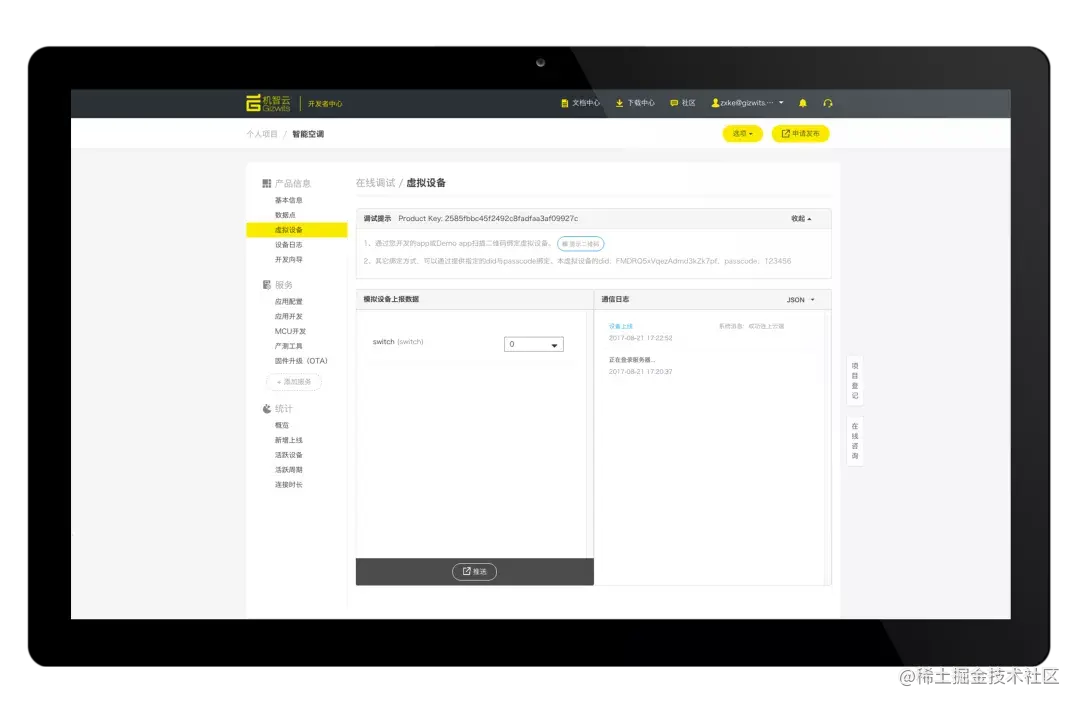 下面是机智云调试APP绑定虚拟设备流程,操作期间请保持网络畅通: