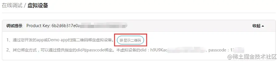 步骤1:点击“调试提示”功能内的红框“显示二维码”来显示虚拟设备二维码