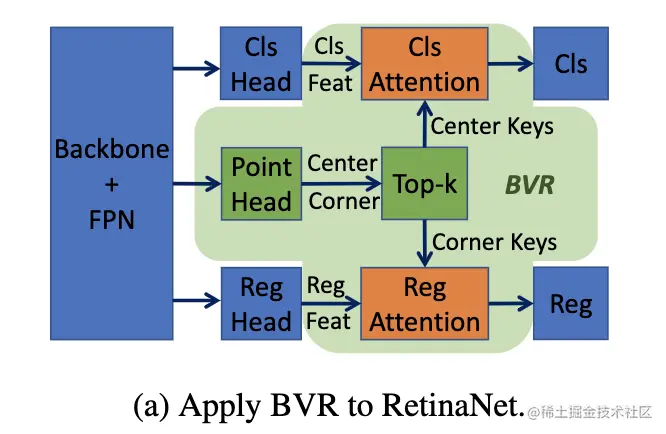 以RetinaNet为例,RetinaNet在特征图的每个位置设置9个anchor,共有个预测框,BVR模块将特征图作为输入(为特征图维度),生成相同大小的增强特征。如图a所示,BVR使用中心点和角点作为辅助的特征,关键点通过轻量级的Point Head网络预测,然后选择少量的点输入到注意力模块中增强分类特征和回归特征。