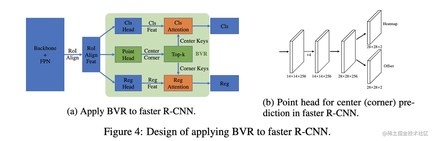 论文也在ATSS、FCOS和Faster R-CNN上尝试BVR模块的嵌入,ATSS的接入方式跟RetinaNet一致,FCOS跟RetinaNet也类似,只是将中心点作为表示方式,而Faster R-CNN的嵌入如图4所示,使用的是RoI Aligin后的特征,其它也大同小异。