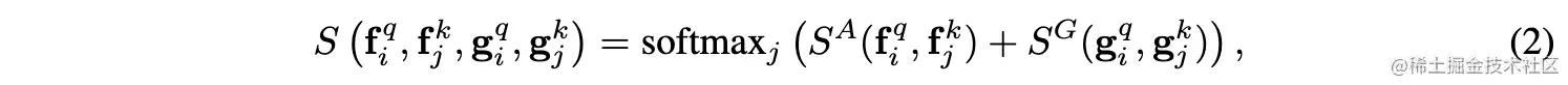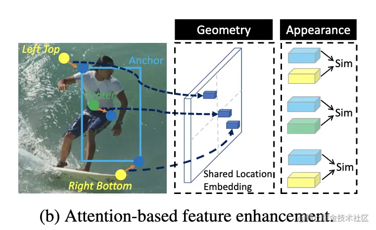 为外观特征相似度,计算方法为scaled dot product。为几何位置相关的项,先将相对的几何向量进行cosine/sine位置embedding,再通过两层MLP计算关联度。由于不同表示方式的几何向量(4-d预测框与2-d点)不同,需从4-d预测框提取对应的2-d点(中心或角点),这样两种不同表示方式的几何向量就对齐了。