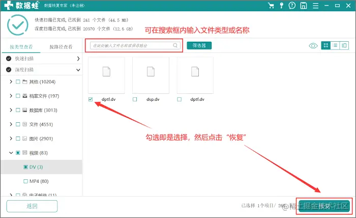 步骤3.扫描结果出来了,左侧各种文件类型就是扫描出来的结果,如果觉得数量太大不想慢慢找的话,可以在上方搜索框内输入想要查找的文件名或类型。找到需要恢复的文件后选择它(勾选文件名左侧方格)就可以点击“恢复”啦!