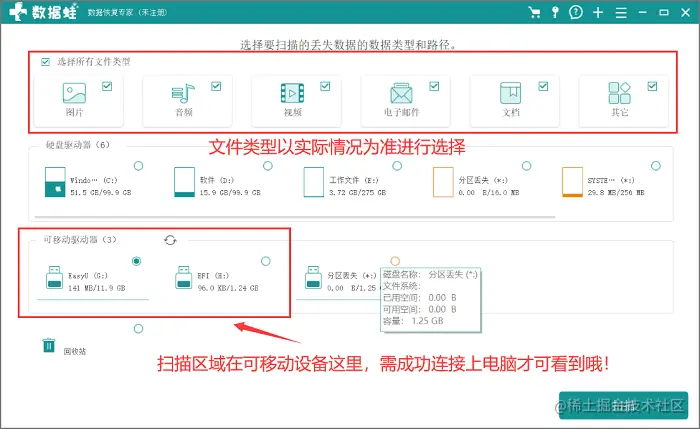 步骤2.在文件类型这里建议全部选择(首次测试更加推荐全选),文件位置要先把你的u盘成功连接电脑才会显示在可移动设备处进行选择。选择操作确认无误后开始“扫描”;