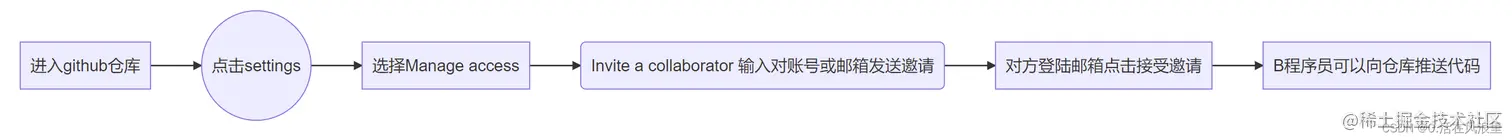 进入github仓库---> settings---->Manage access----->第一次添加会弹出密码输入框------>Invite a collaborator (输入你邀请的B程序员github账号)----> 发送邀请------>B程序员登陆邮箱接受邀请------B程序员可以向仓库推送代码