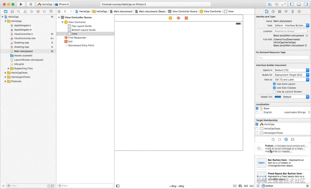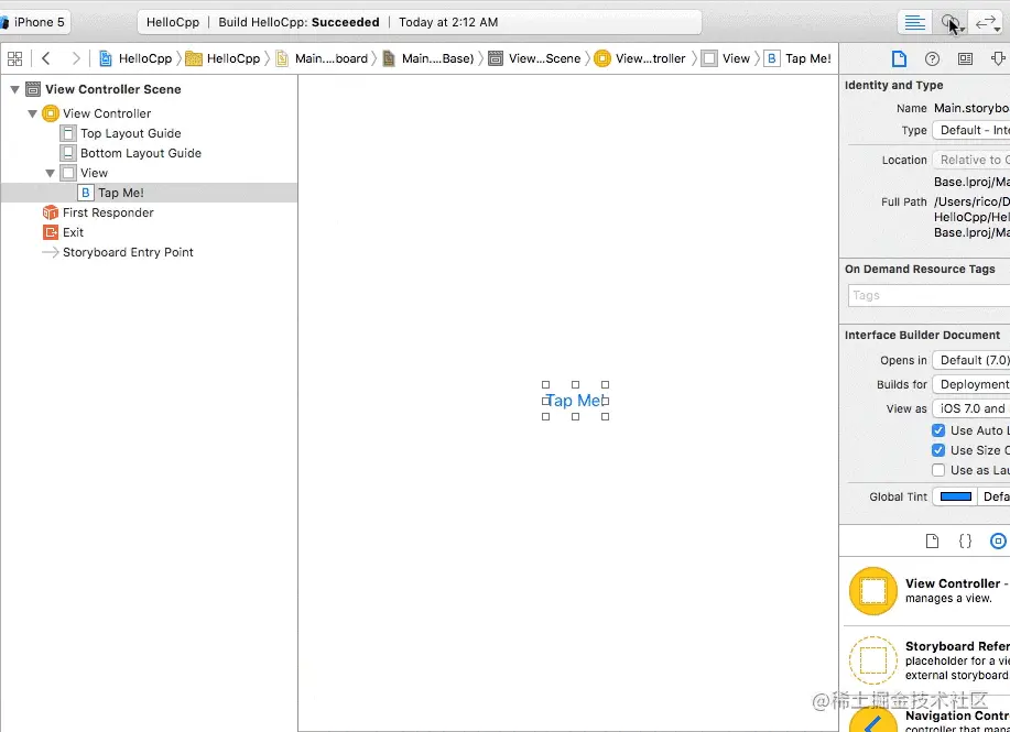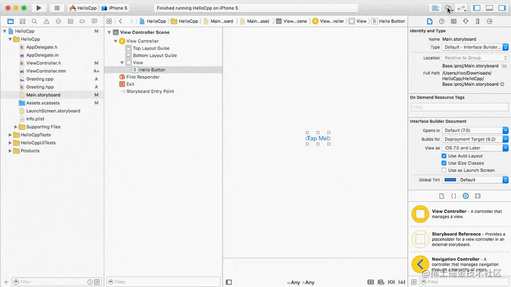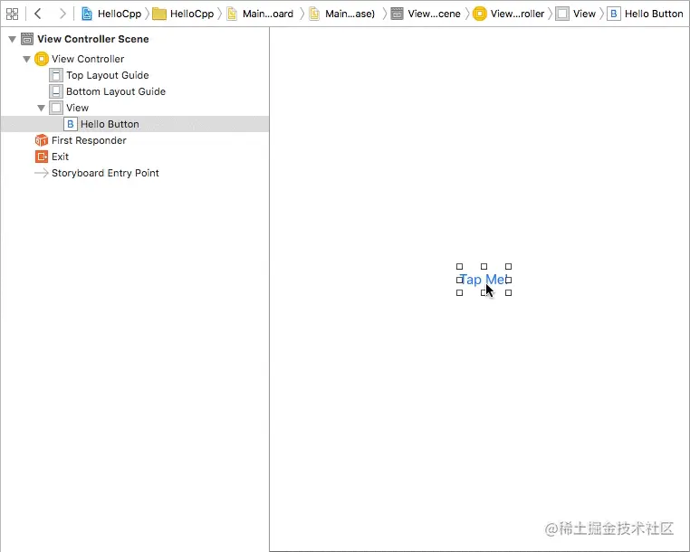 这个方法调用C++类Greeting中定义的greet()方法,并使用它返回的字符串值来替换_Tap Me!_按钮的标题。使用同样的_control + drag_技术将按钮连接到这个动作。回到_Main.storyboard_屏幕,通过工具栏打开助手编辑器,然后_control + drag_从按钮到- (IBAction)showGreeting方法主体的连接器。- (IBAction)showGreeting方法左边的空心小圆圈应该被激活/填满,表明_Tap Me!_按钮现在已经连接到该动作。