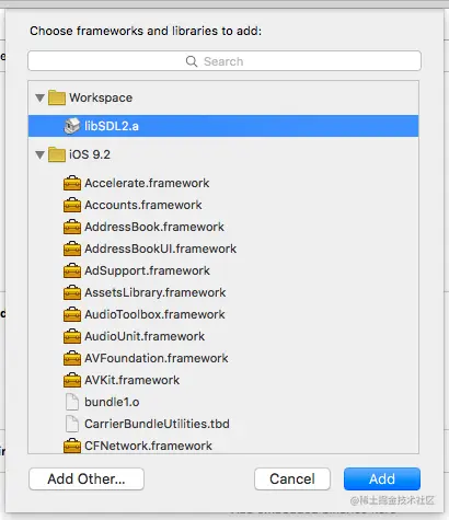 点击_+_按钮,手动添加_libSDL2.a_和下列框架。