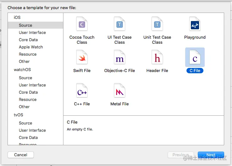 创建一个C++类,将从Objective-C文件中调用。使用_File -> New -> File...菜单项或按_⌘ + N_创建一个新文件。在出现的文件模板窗口中,选择_iOS -> Source -> C++ File_并点击_Next。