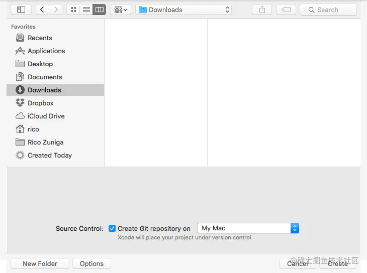 因为它不是一种真正的语言,所以没有选项可以创建一个Objective-C++项目。可用的是Objective-C或Swift。对于这个项目,选择Objective-C。其他选项保持不变,然后点击_Next_,选择一个文件夹来保存项目。