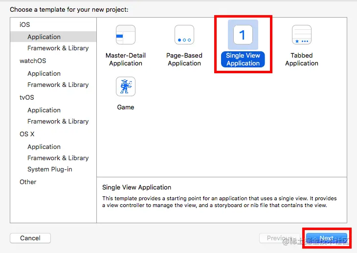 在模板选择界面,从iOS应用程序标签中选择_Single View Application_并点击_Next_。