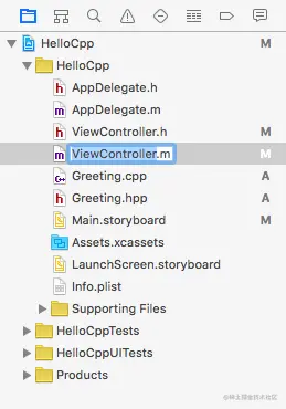 是时候添加一些C++代码了。如果这是你第一次使用C++,请查看关于该语言的本教程。看看左边的_项目导航_窗格。大多数文件都以_.h_或_.m_结尾。那些以_.h_结尾的是头文件,而那些以_.m_结尾的是Objective-C源文件。