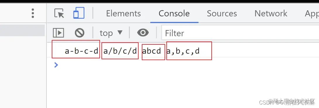 var list = ["a", "b", "c", "d"]; // "a-b-c-d" var result = list.join("-"); //"a-b-c-d" var result1 = list.join("/"); //"a/b/c/d" var result2 = list.join(""); //"abcd" var result3 = list.join(); // a,b,c,d 默认不写就是逗号 console.log(result,result1 ,result2 ,result3 );