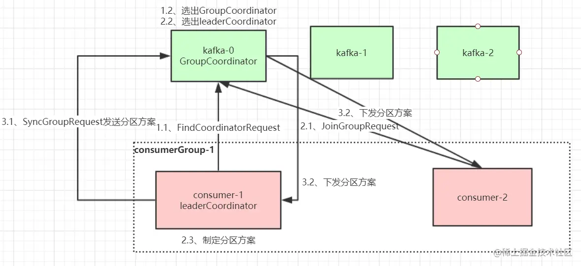 consumer group的位移信息写入哪个consumer_offsets_*,那么其分区leader所在的borker就是coordinator。