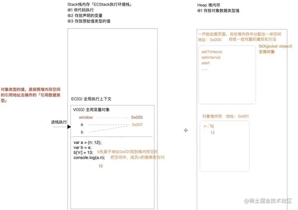 与原始值类型的区别唯一就是,一个按值操作,一个按引用地址操作。而且对象类型值是存储在堆内存中的,并把16进制的内存地址交给栈内存,栈内存中(VO)会创建一个变量来指向这个地址。