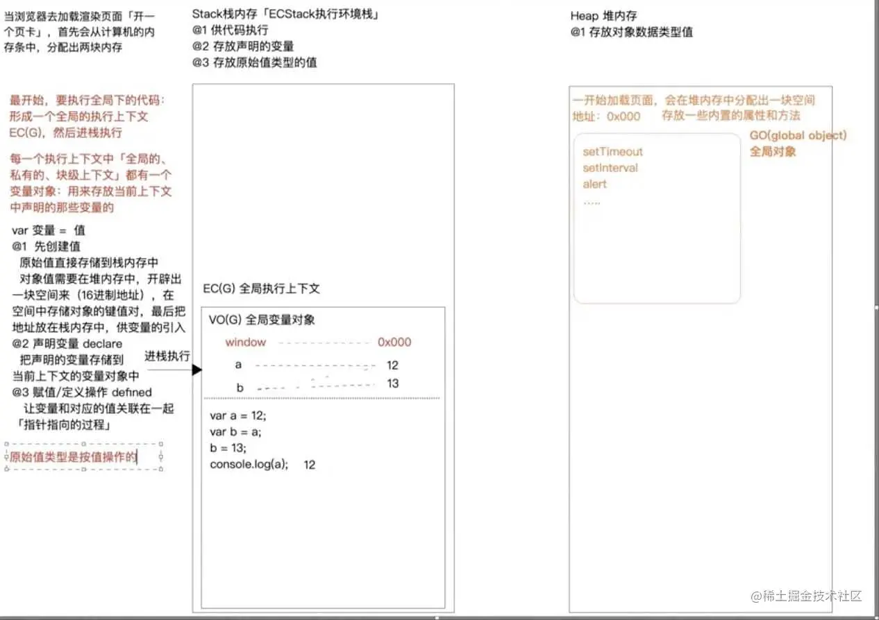 浏览器给我们提供了很多内置的 api,比如 setTimeout, setInterval 等,这些方法是挂在全局对象上的,所以每次一打开页面,都会在开辟出的堆内存中开辟出一个空间,用来存放这些全局可以调用的属性和方法,而这个处于堆内存中的一小块空间,我们称之为 GO (global object)。