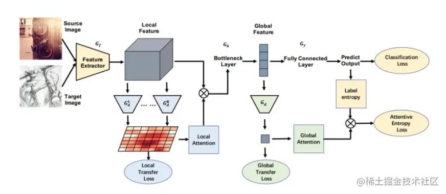 文献《Transferable Attention for Domain Adaptation》提出了 TADA(下图是 TADA 结构图) 方法通过注意力机制挑选出可迁移的图像以及图像中可以重点迁移的区域,提高模型性能。并且提出了两个与注意力机制结合的迁移过程:Transferable Local Attention 和 Transferable Global Attention