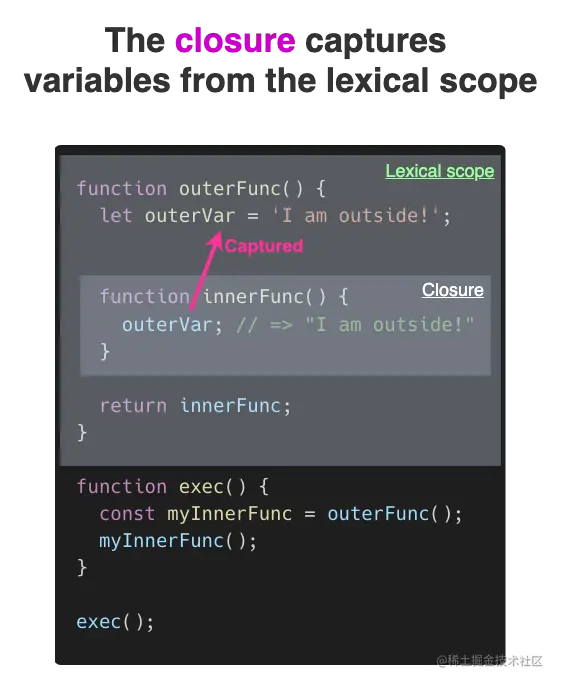 换句话说,innerFunc()「记住了」(closes over)来自它词法作用域内的变量(outerVar)。